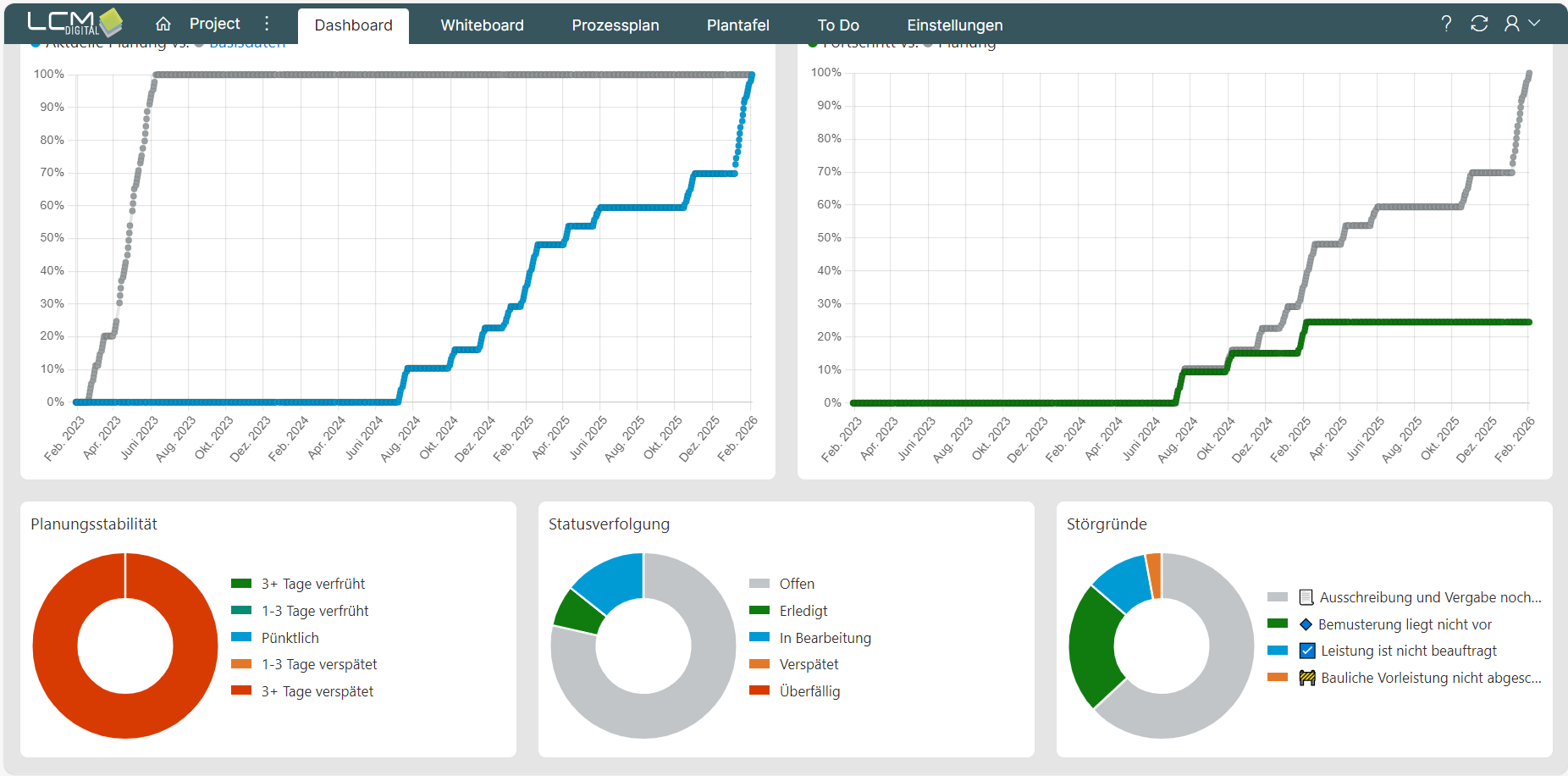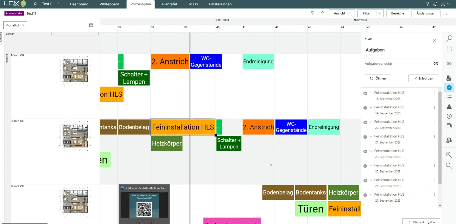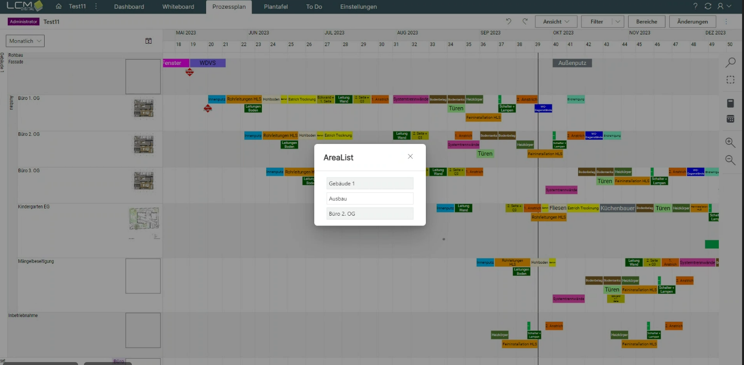 Beim Ändern der Ansicht von Status auf Gewerke, ändert sich die Farbe der Prozesse von Beispielsweise grau/grün/rot (Status) auf die Farben der Gewerke.