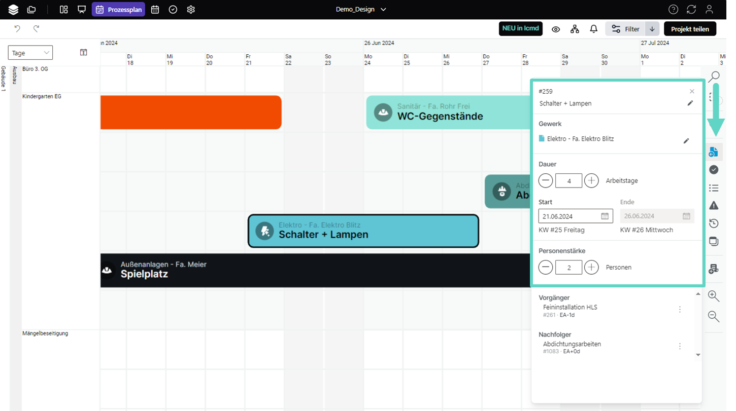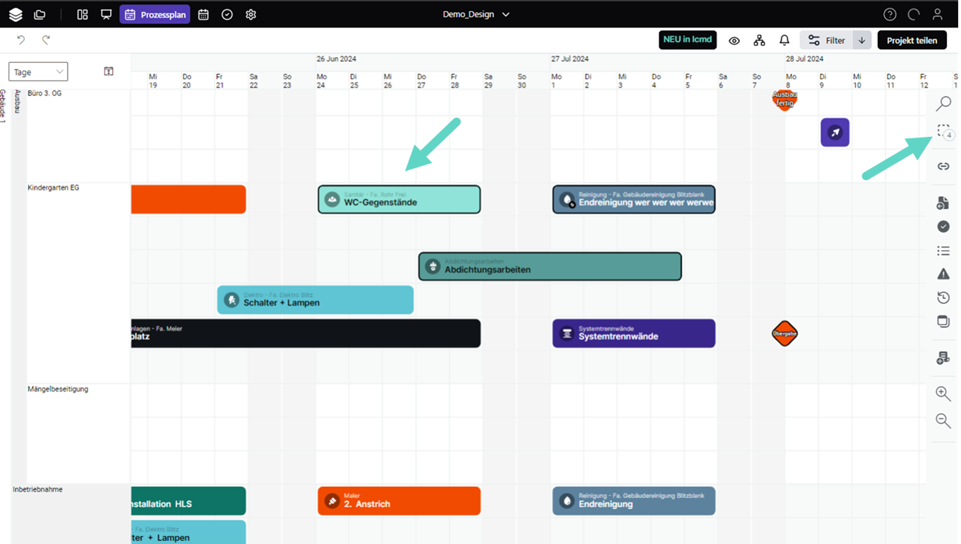 Tätigkeiten und Ereignisse im Bauprozess werden in lcmd als Prozesse und Meilensteine abgebildet. Prozesse können dabei beliebige Dauer haben und sind in lcmd automatisch auch als ein-tages-Tätigkeiten vorhanden. Somit können Sie direkt den gewünschten Detailierungsgrad für Ihre Projekte verwenden.