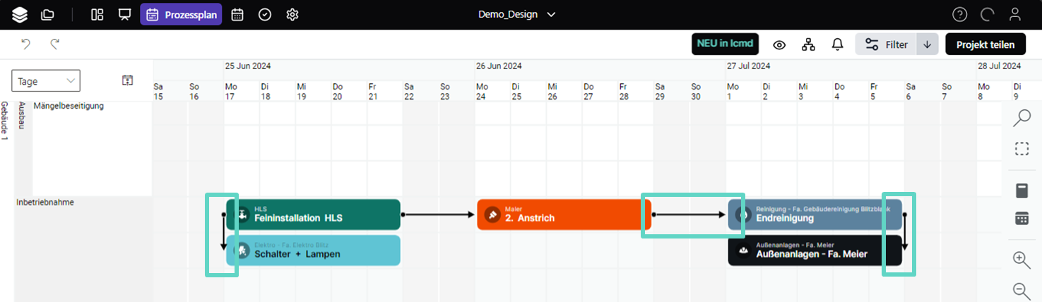 - Sie können die Dauer eines Prozess bearbeiten, indem Sie mit der Maus über den linken oder rechten Rand des Prozess fahren und dann mit gedrückter linker Maustaste die Prozesslänge verändern.