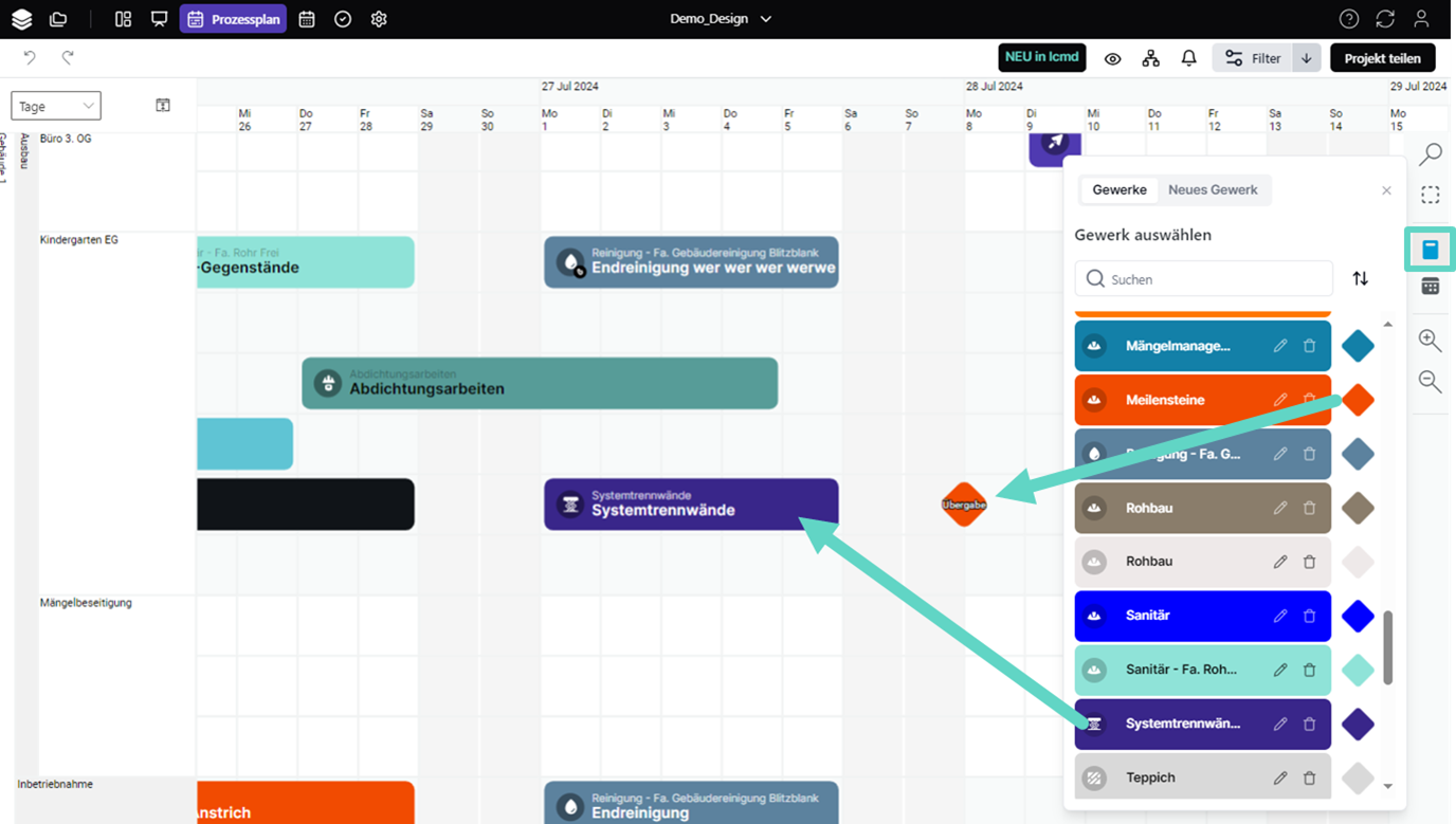 - In der Seitenleiste finden Sie die Liste aller Gewerke im Prozessplan, die Sie zuvor erstellt haben.