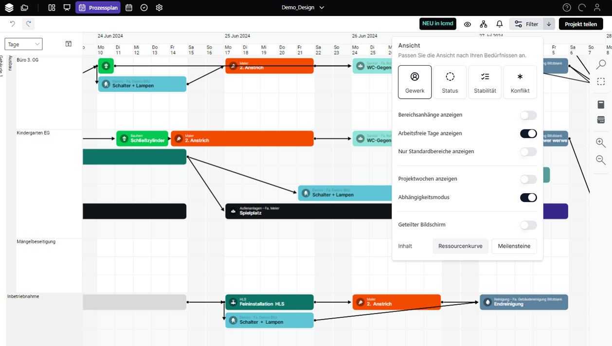 - Um Prozesse oder Meilensteine miteinander zu verknüpfen, öffnen Sie über die Ansichts-Einstellungen den Abhängigkeitsmodus.