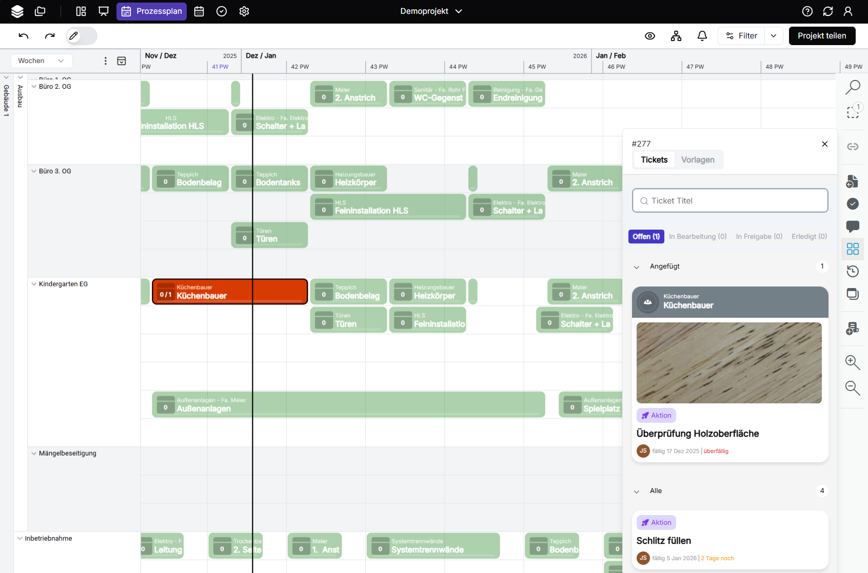 In der Sektion To Dos werden alle Tickets angezeigt: Diese sind nach Status und nach Zugehörigkeit zum Prozess gegliedert.