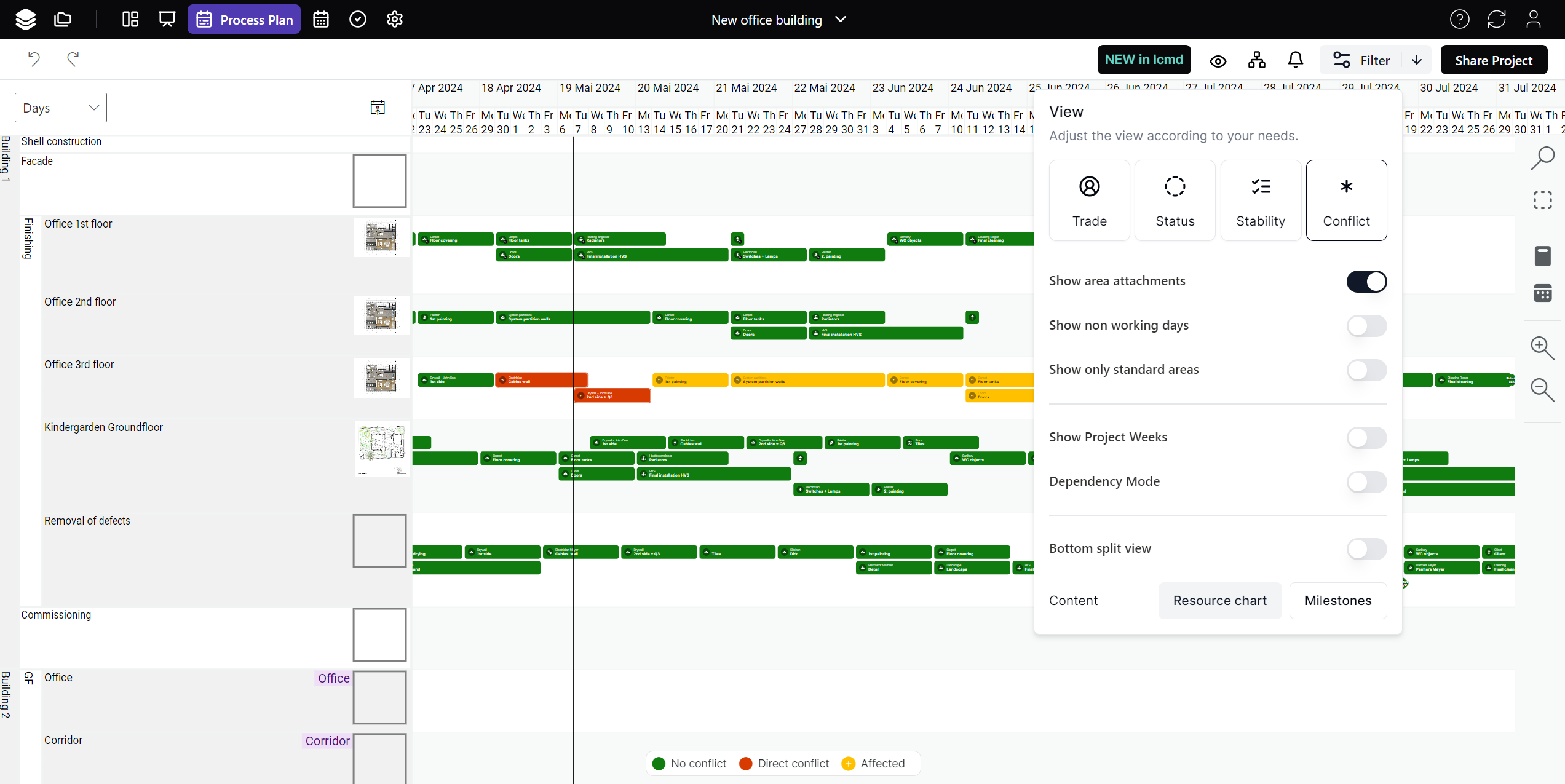 To resolve a conflict, you can either move the affected processes and milestones manually or have them resolved automatically with the help of lcmd.