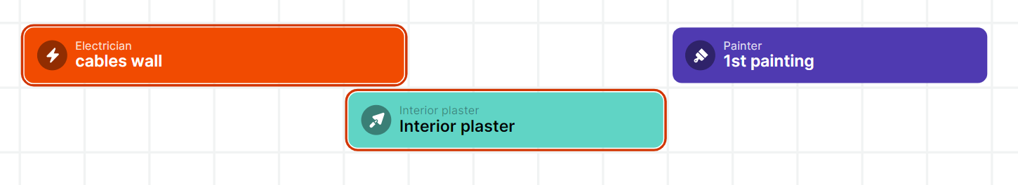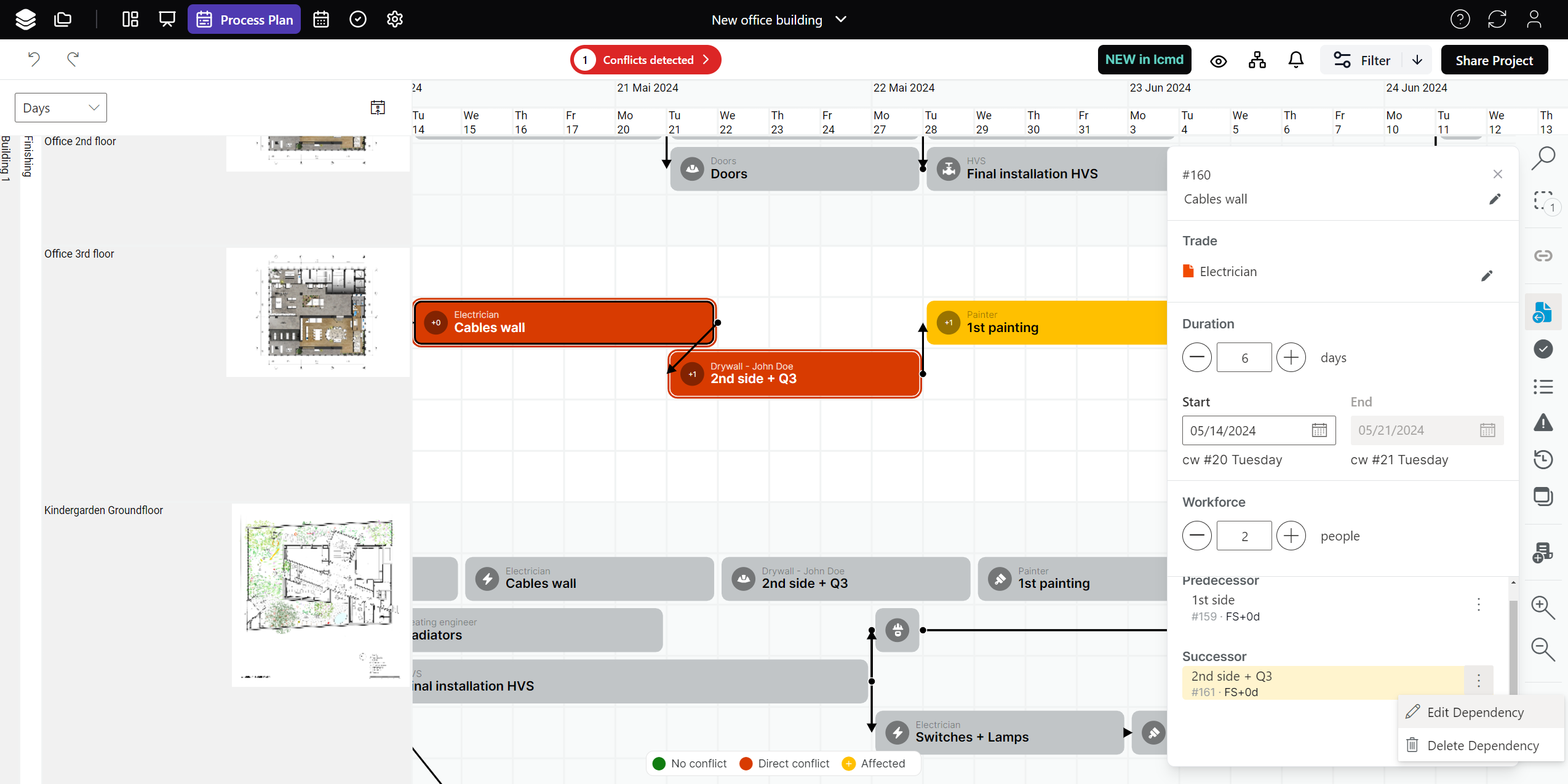 A conflict between two processes or milestones arises when a dependency is not met. In lcmd there are various options for displaying or resolving these conflicts. So that you can decide for yourself how a collision should be resolved, lcmd itself does not move any processes, but shows you what options you have.