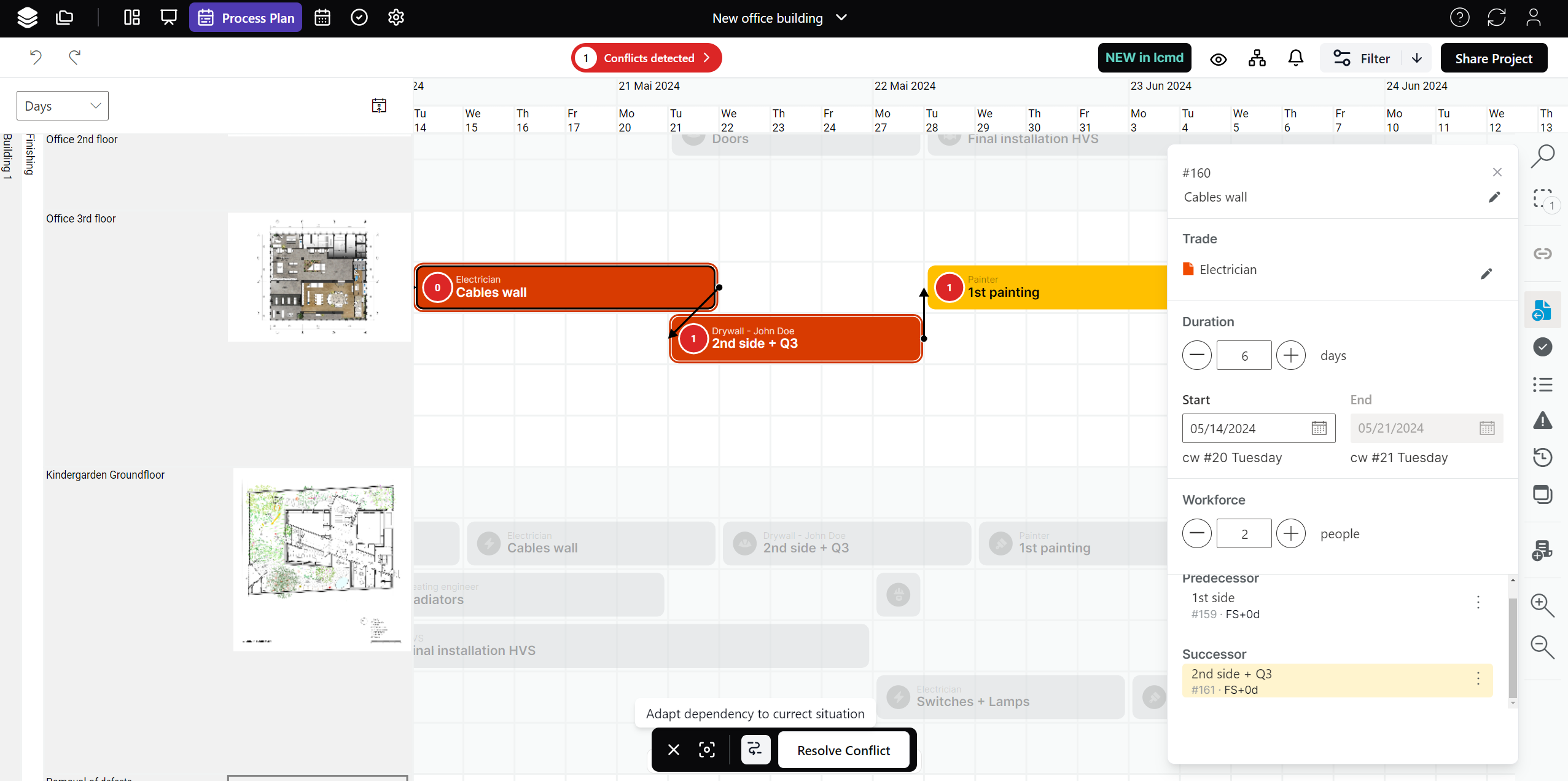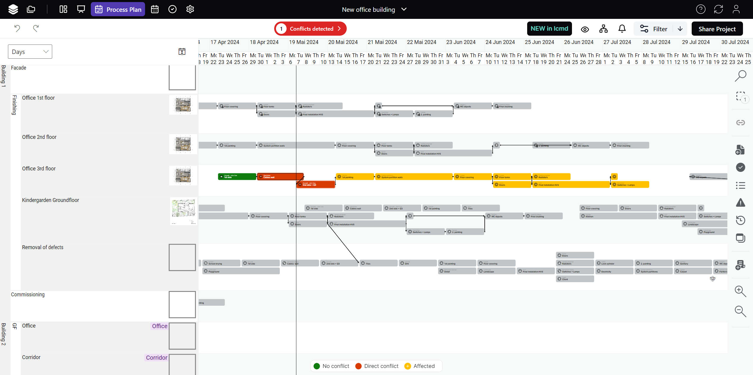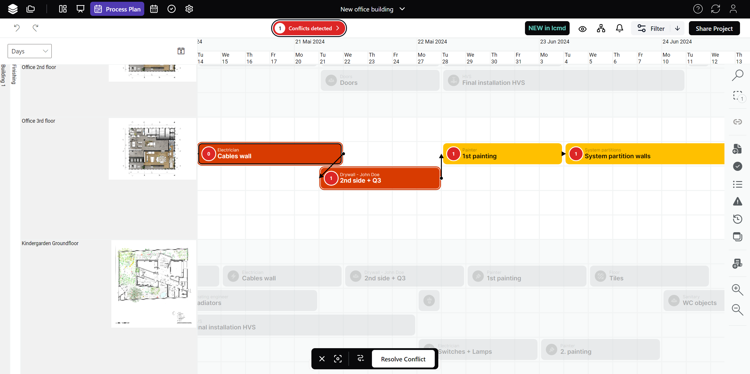 - If you select a red process, the red “Conflicts detected” button appears at the top center of the process plan.